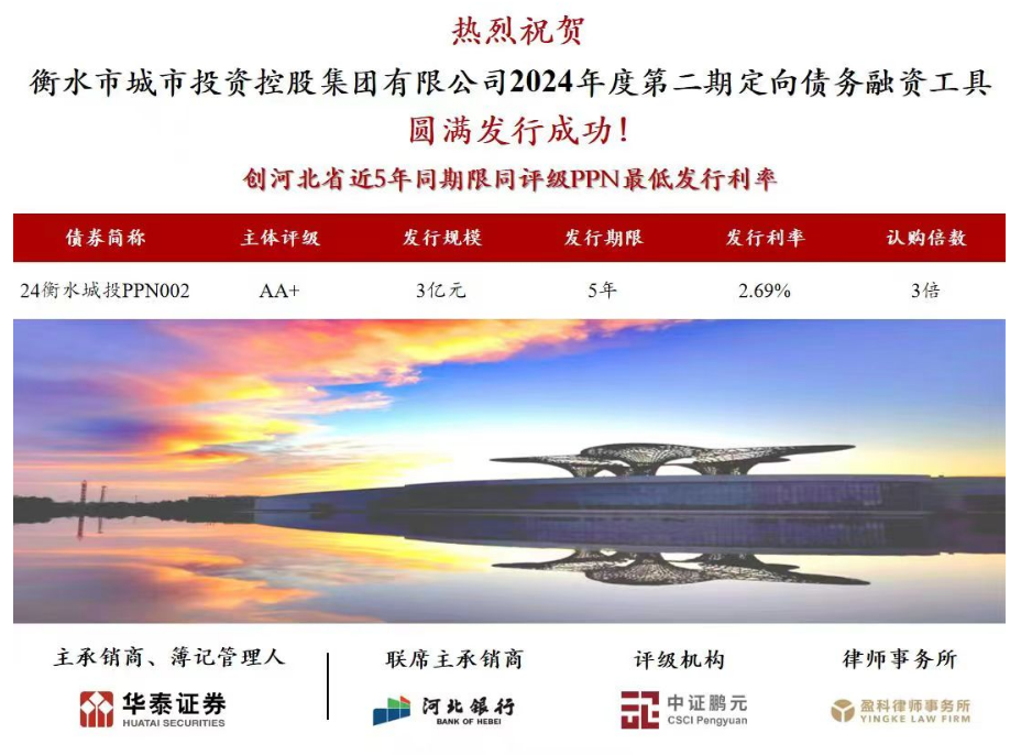6月26日,市城投集團(tuán)2024年度第二期定向債務(wù)融資工具(PPN)發(fā)行工作圓滿完成。本期債券募集資金3億元人民幣,期限為5年,利率為2.69%,認(rèn)購倍數(shù)高達(dá)3倍,這一成績(jī)不僅彰顯了市場(chǎng)對(duì)集團(tuán)信用和發(fā)展前景的高度認(rèn)可,也創(chuàng)下了河北省近5年同期限同評(píng)級(jí)PPN的最低發(fā)行利率。